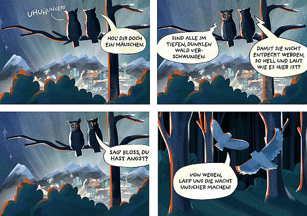 Die Helle-Not-Cartoons thematisieren die Konfrontation der heimischen Tierwelt mit Lichtverschmutzung.